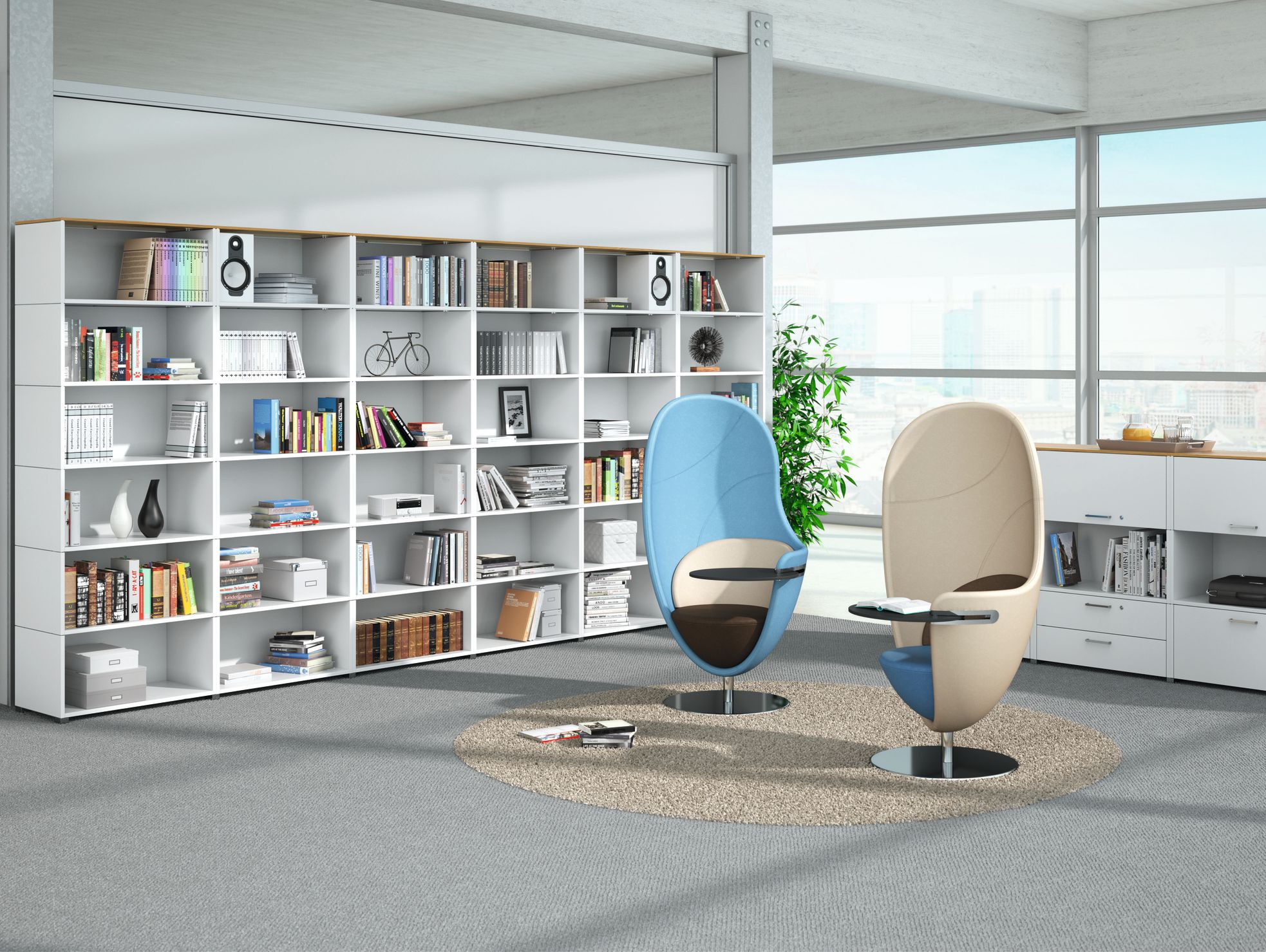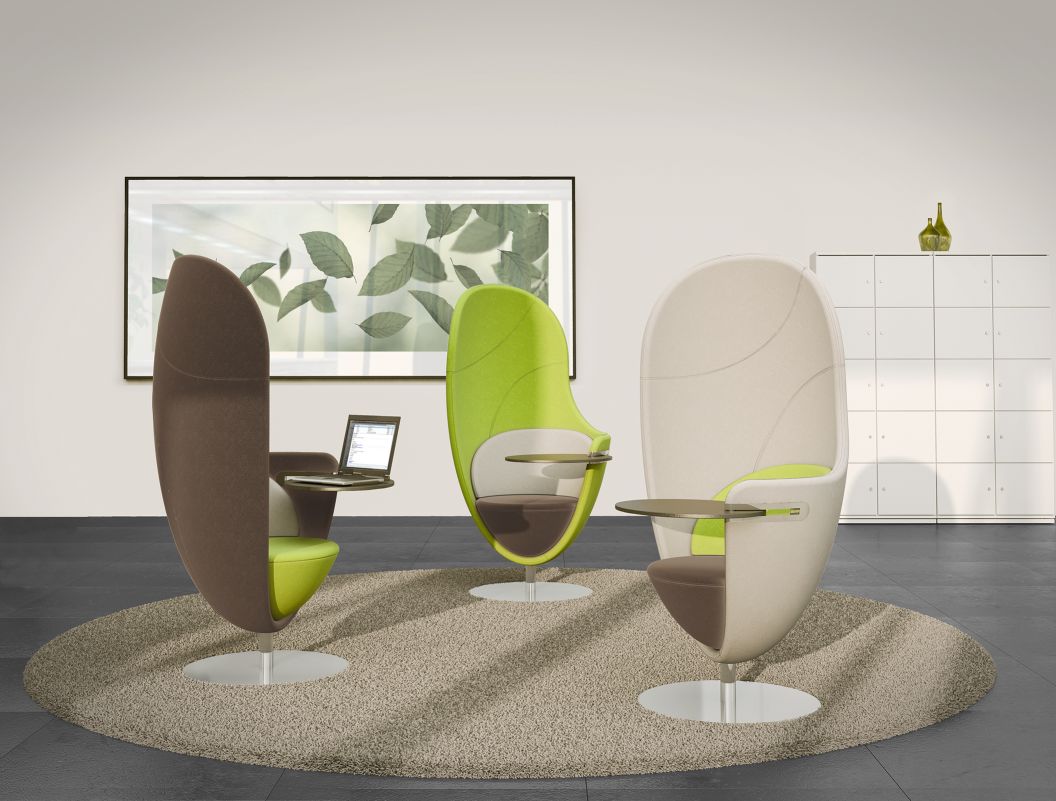 Lean back and relax as you work. Good ideas are what drive companies forward and sometimes the best way to come up with them is by brainstorming with colleagues. At other times a little privacy and concentration is what’s needed. On the basis of this, we developed the Net.Work.Place lounge chair. It embraces you like a cocoon and is perfect for undisturbed working, phone calls or relaxing. You can swivel round to face your colleagues – then turn away again to be alone with your thoughts once more.