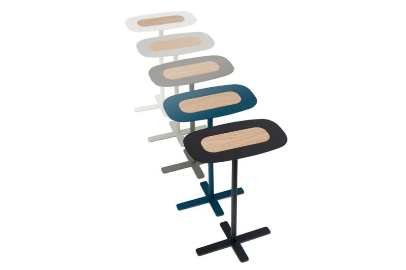 Materials & Finishes – Powder coated steel in fine texture and Oak veneer on MDF. The light blue model has a gloss finish on the steel.