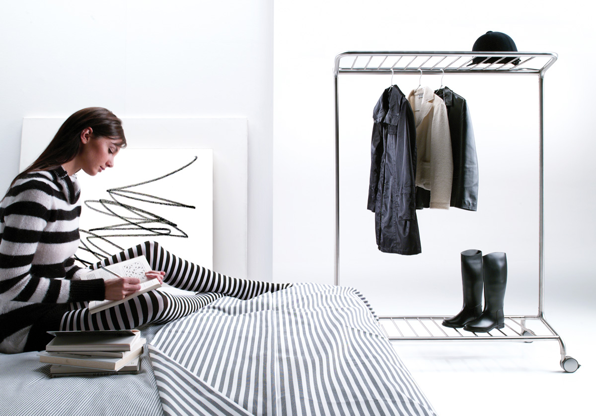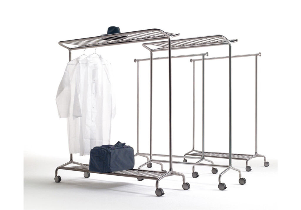This coat rail is on castors (2 castors with brakes). The racks are available in two sizes: 1280mm long x 530 mm wide x 1700 mm high and 1680 mm long x 530 mm wide x 1700 mm high. Four versions are available – coat rail, coat rail with bottom bag rack, coat rail with a hat rack and coat rail with hat and bag racks.