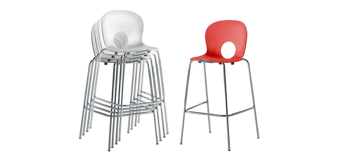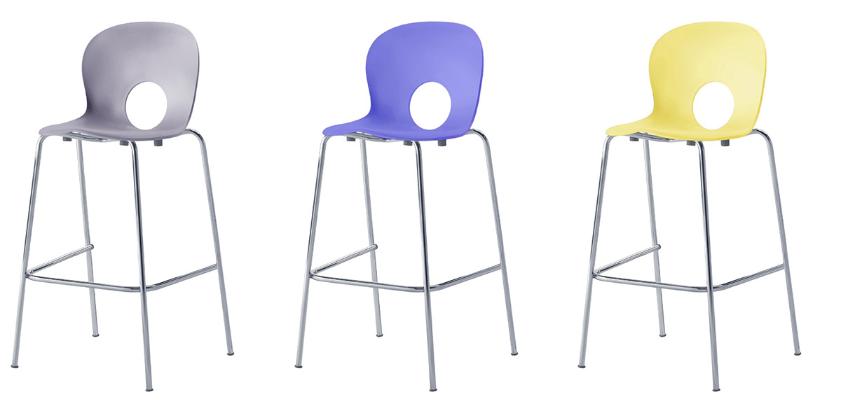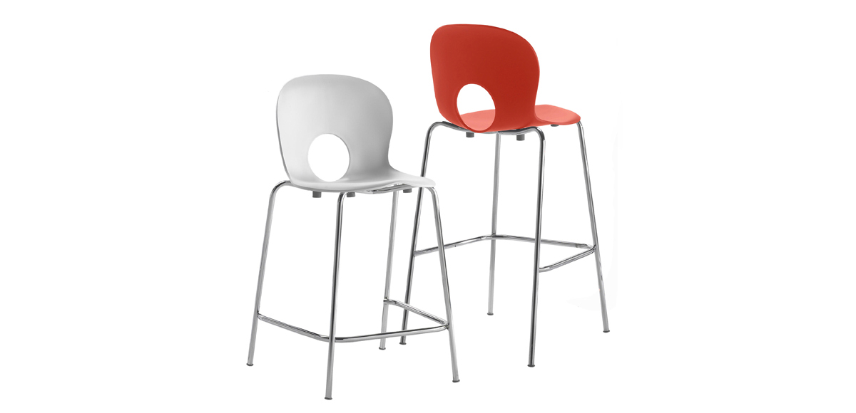 The Olivia range is a Rexite icon, unmistakable with its soft lines and perfectly circular hole in the back, this stool version lends a tasteful air to residential, bars and public spaces. The seat is made from reinforced polypropylene UV stabilized and the frame is chromium plated steel. The seat is available in white, red, black, blue, orange, primrose yellow, gentian blue, anthracite, very light blue, pearl grey, and light green. Two seat heights are available – 670mm and 790mm. The stool is stackable up to four chairs high.