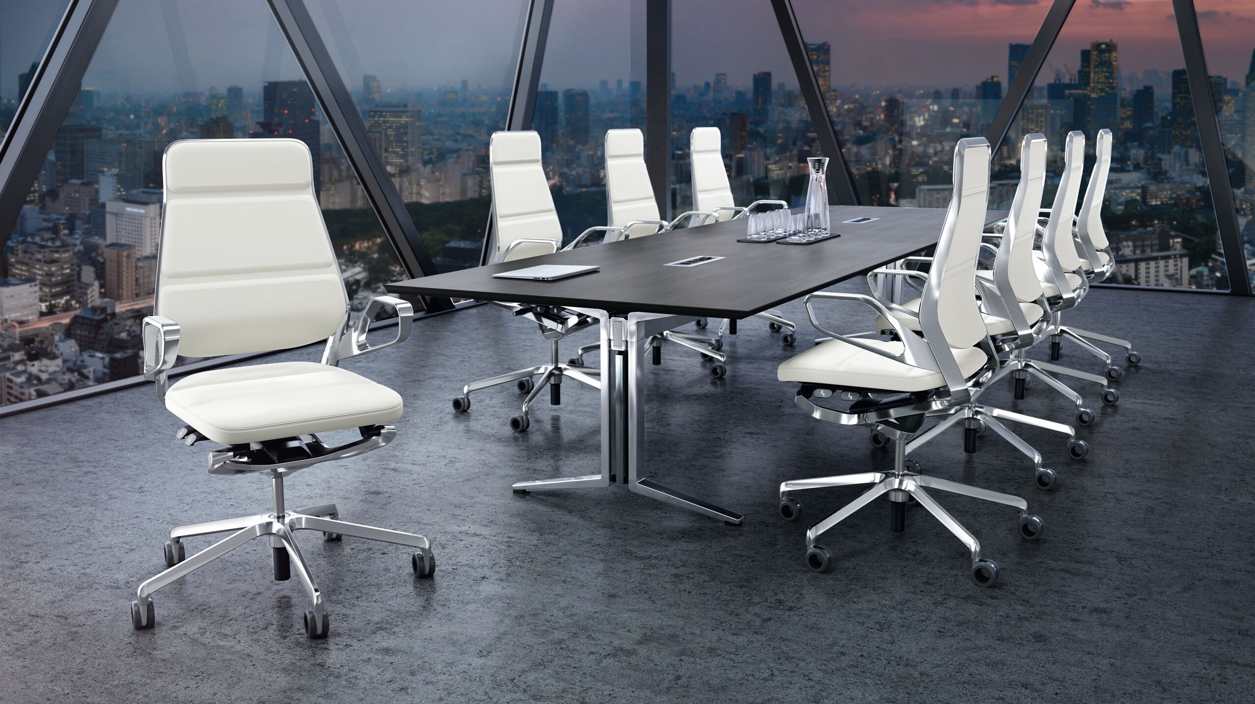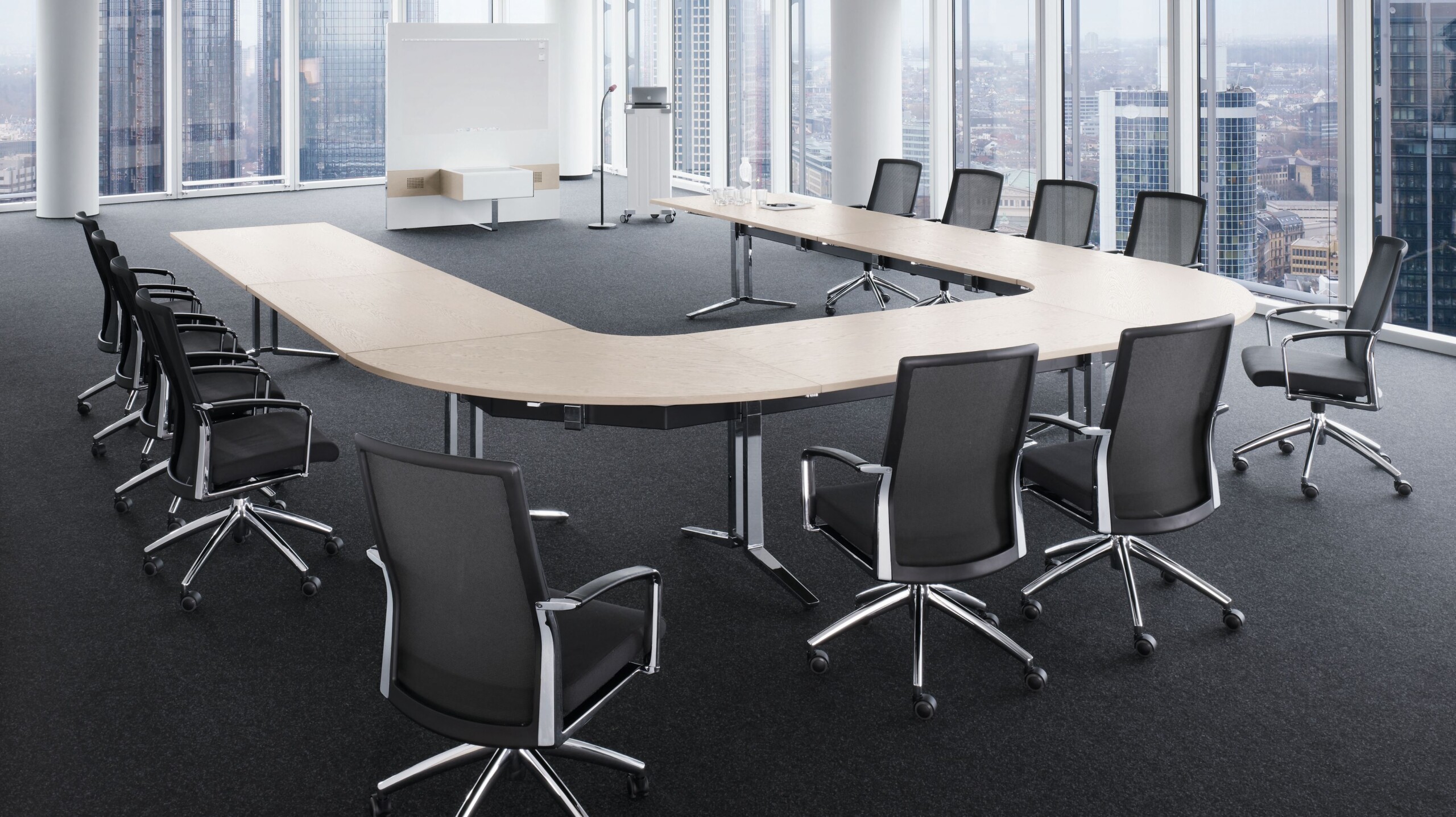 The flexible media-oriented conference system, PLENUM.K, sets new standards in meetings and conference rooms. The design is based on modern bridge architecture with an above-average span of up to four metres. The number of desk legs is reduced to a minimum. This gives conference delegates more legroom. Thanks to the link node, PLENUM.K can be configured in a number of ways – providing a high level of planning flexibility for meetings or concentrated working in groups. PLENUM.K combines technical functionality by integrating state-of-the-art media technology, high quality and a superior aesthetic standard for individually-tailored requirements.