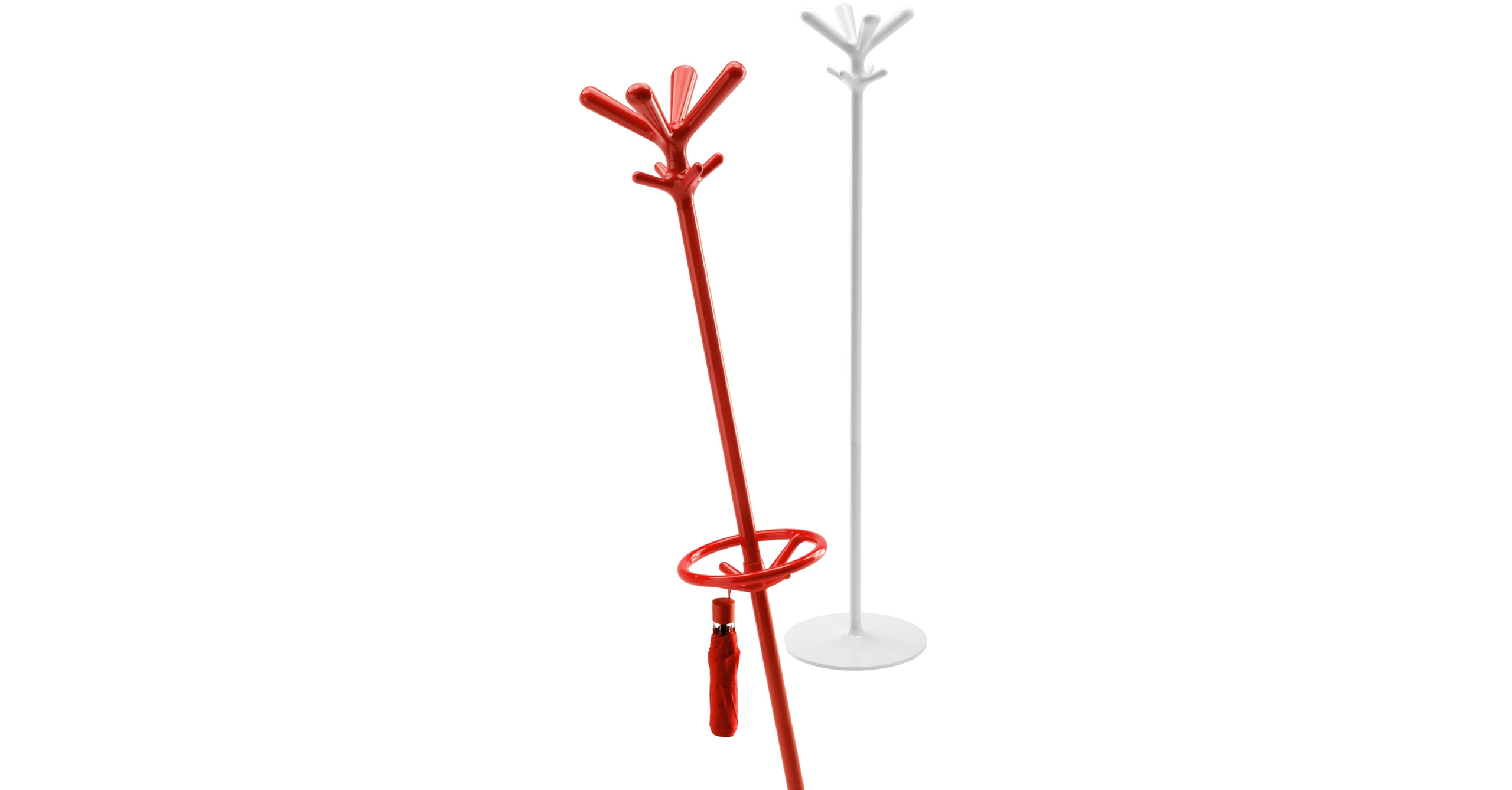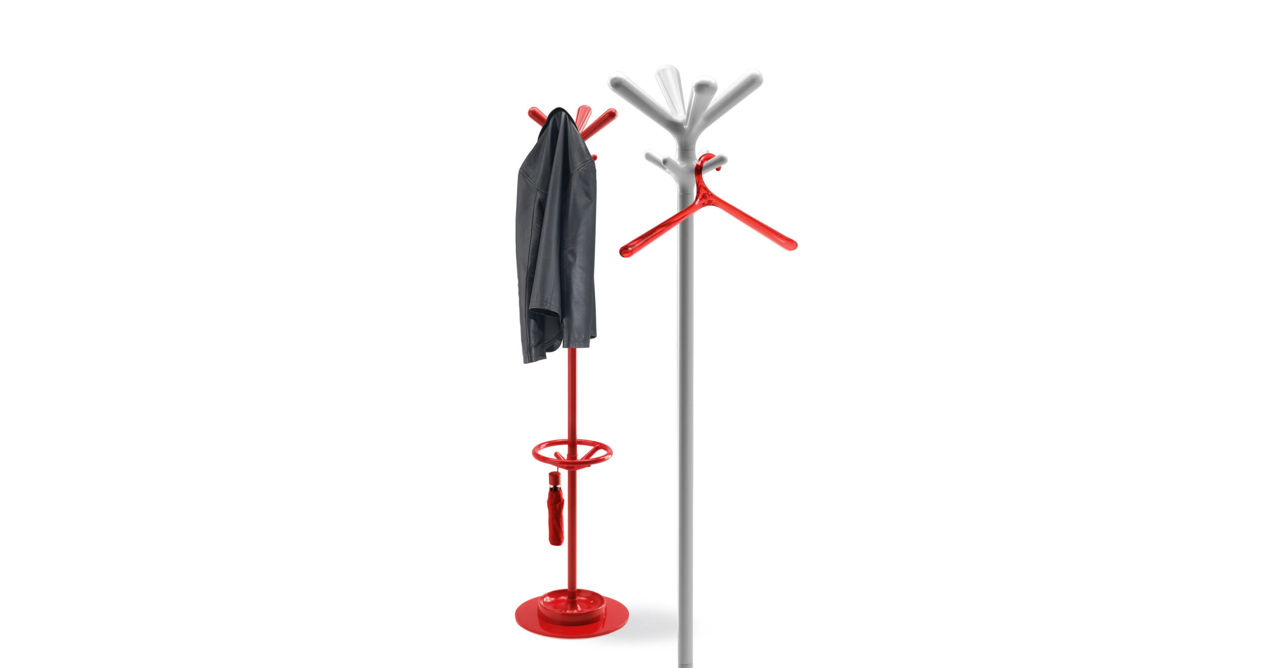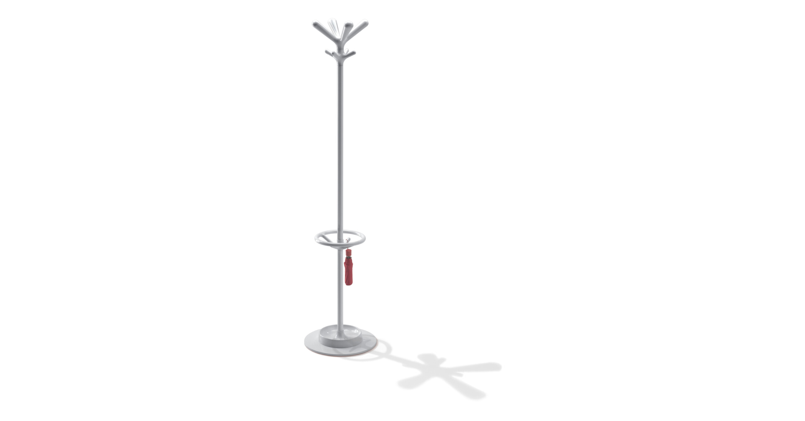 The coat stand has an engineering polymer head, painted steel rod, steel base with engineering polymer cover. Optional umbrella kit. Colours- white, black, red, cyclamen pink, primrose yellow, grass green, gentian blue, pearl grey and aluminium finish. Option for transparent head and umbrella kit.