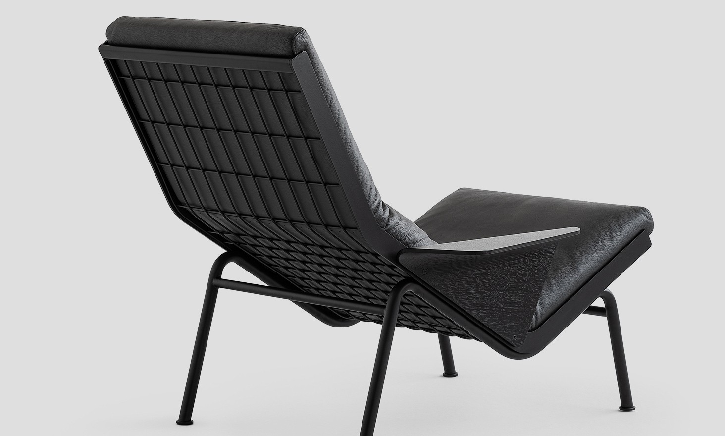 Yet, the two oppositions form a consistent piece. To further enhance the user’s comfort, the armchair comes with a footrest and a bolster roller headrest with a weight, serving as an adjustable headrest.