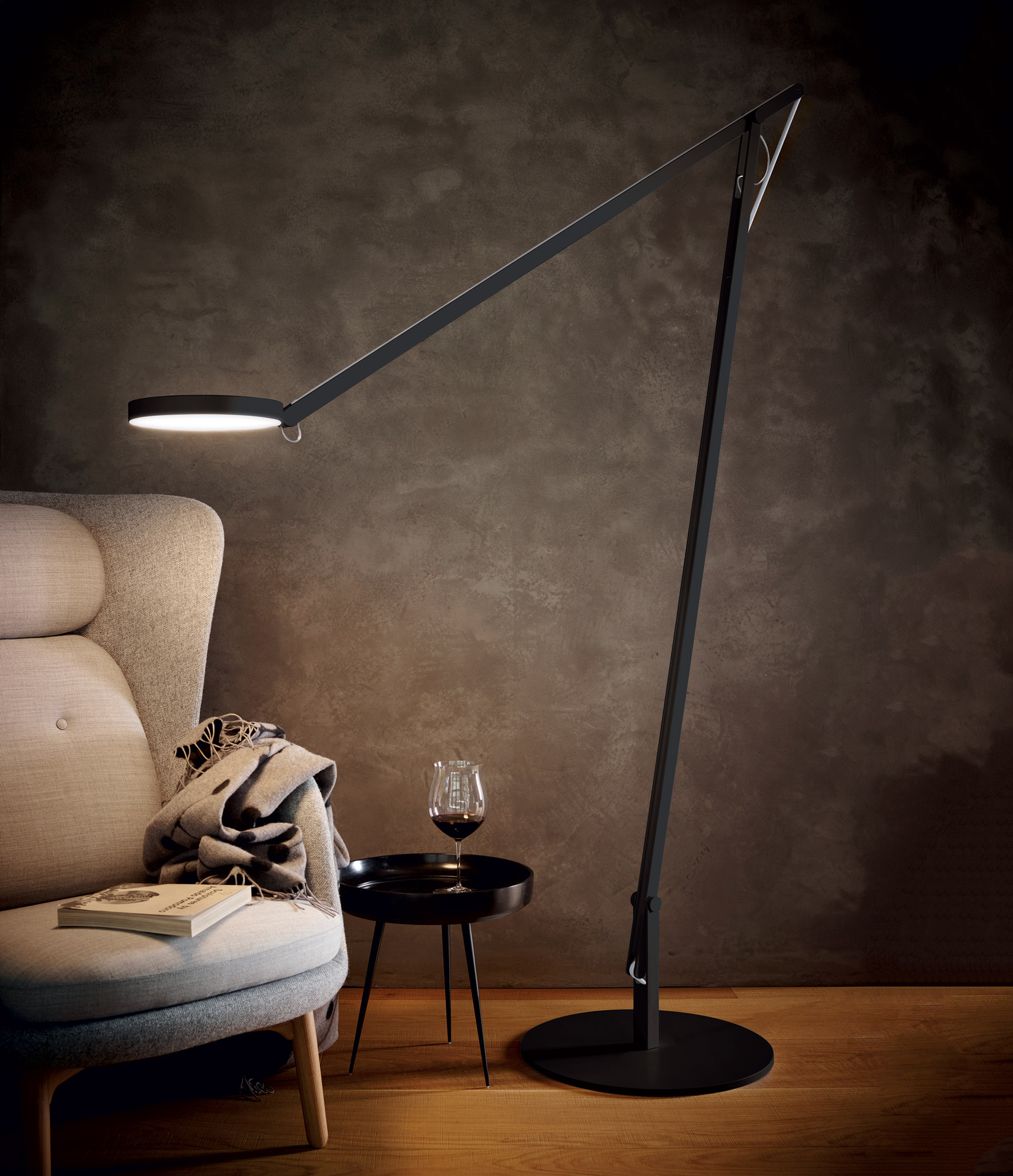 String XL is a large LED floor lamp designed to illuminate an area from above. The aluminium structure is supported by a base with cast-iron ballast with a coloured elastic cord that compensates the movements. A touch dimmer is built into the lower arm and the head, which features a polycarbonate diffuser, shields the direct light of the LEDs and is adjustable. The adjustability and size of the String XL is ideal for indirect lighting over a corner of the sofa, dining table, or study area.